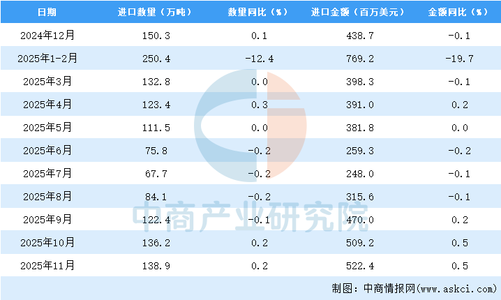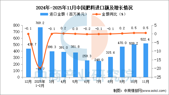 2025年11月中國肥料進(jìn)口量及金額增長情況