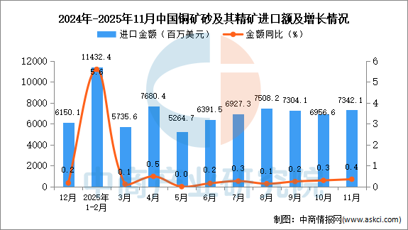 2025年11月中國(guó)銅礦砂及其精礦進(jìn)口量及金額增長(zhǎng)情況