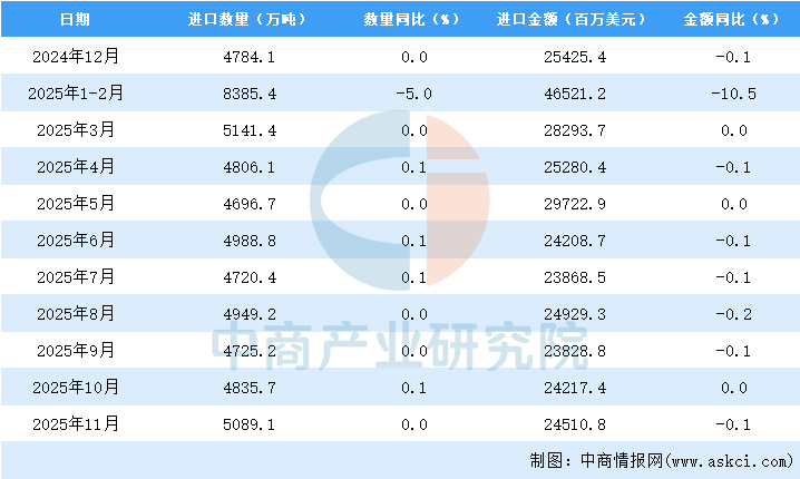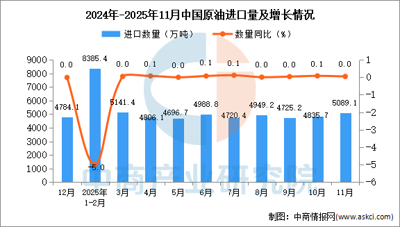 2025年11月中國原油進(jìn)口量及金額增長情況