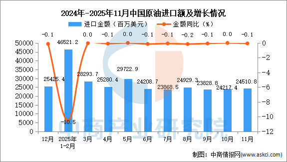 從金額方面來看,2025年11月中國原油進(jìn)口金額24510.8百萬美元,同比下降0.1%;1-11月中國原油進(jìn)口金額269808.6百萬美元,同比下降9.9%。
