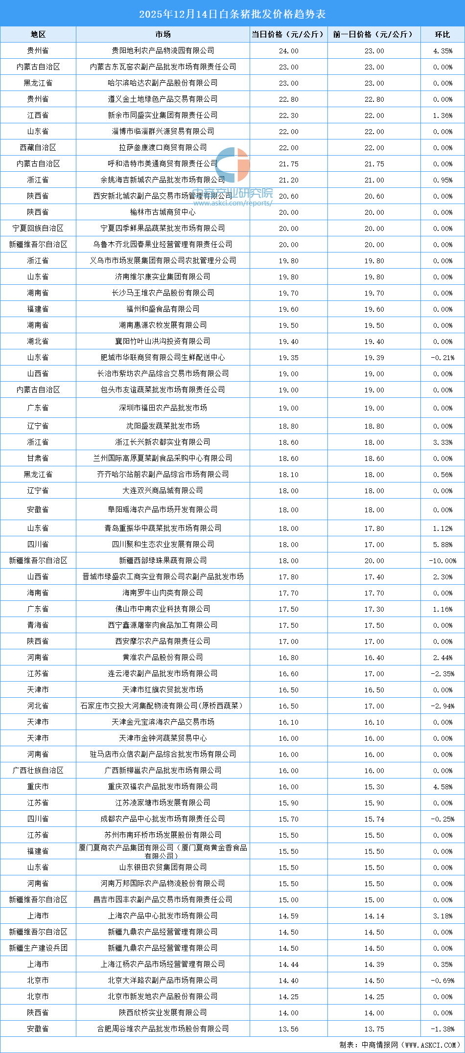 中商情報網(wǎng)訊:最新數(shù)據(jù)顯示:12月14日全國白條豬平均價格為18.00元/公斤。其中,白條豬價格最高的市場是貴陽地利農(nóng)產(chǎn)品物流園有限公司,當(dāng)日價格為24.00元/公斤,環(huán)比上漲4.35%。白條豬價格最低的是合肥周谷堆農(nóng)產(chǎn)品批發(fā)市場股份有限公司,當(dāng)日價格為13.56元/公斤,環(huán)比下跌1.38%。