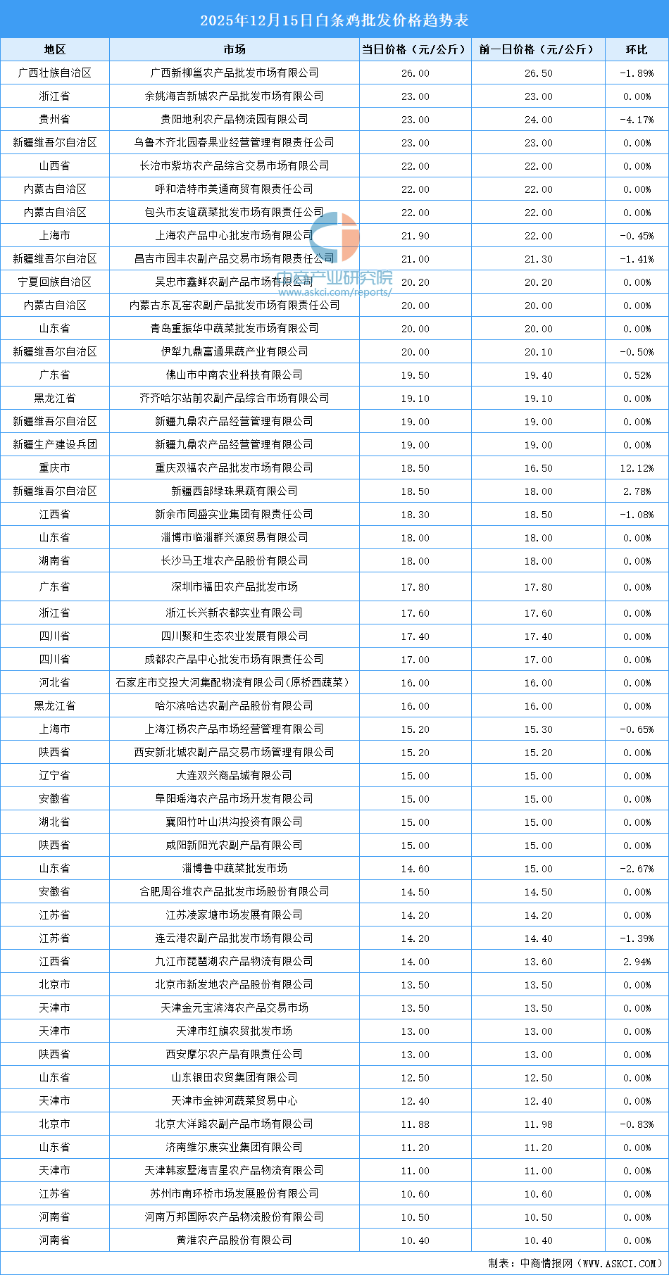 中商情報網(wǎng)訊:最新數(shù)據(jù)顯示:12月15日全國白條雞平均價格為16.85元/公斤。其中,白條雞價格最高的市場是廣西新柳邕農(nóng)產(chǎn)品批發(fā)市場有限公司,當日價格為26.00元/公斤,環(huán)比下跌1.89%。白條雞價格最低的市場是黃淮農(nóng)產(chǎn)品股份有限公司,當日價格為10.40元/公斤,環(huán)比持平。