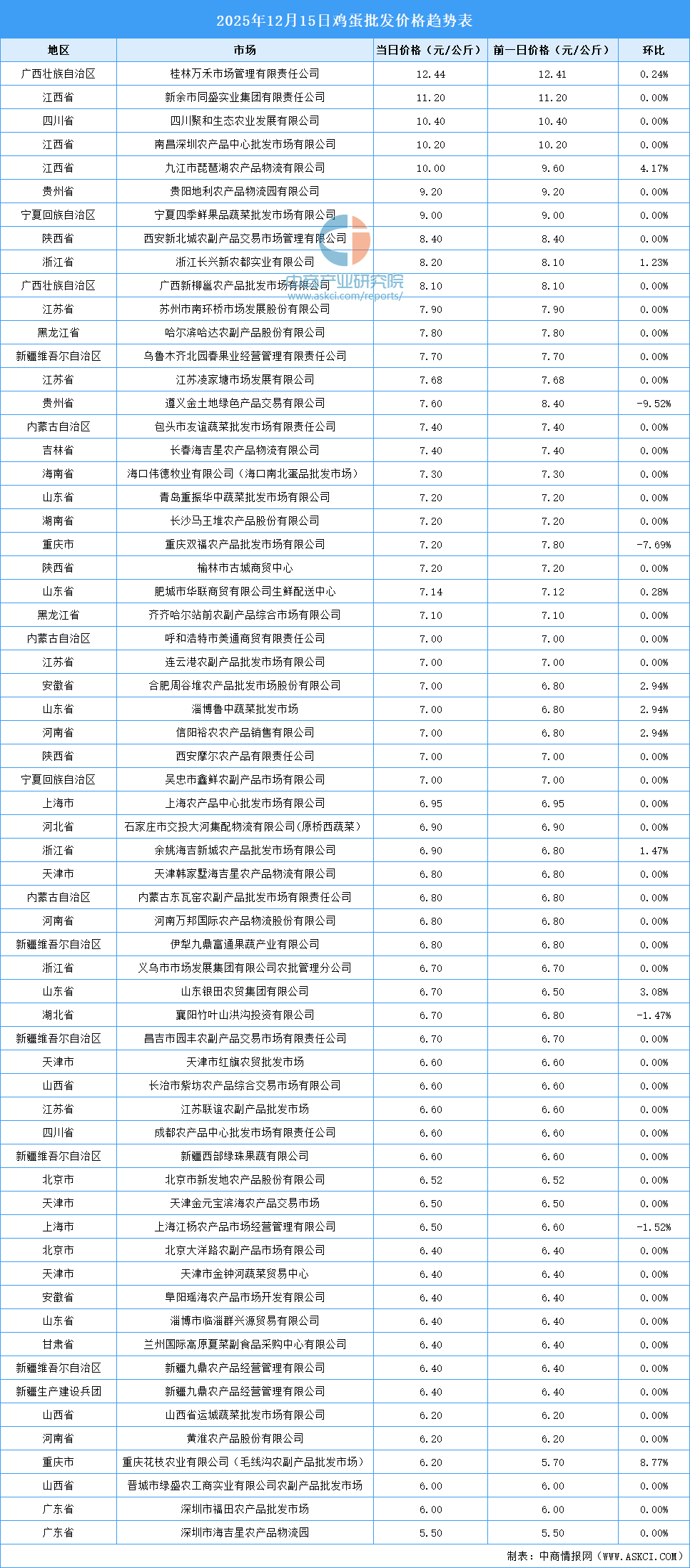 中商情報(bào)網(wǎng)訊:最新數(shù)據(jù)顯示:12月15日全國雞蛋平均價(jià)格為7.27元/公斤。其中,雞蛋價(jià)格最高的市場是桂林萬禾市場管理有限責(zé)任公司,當(dāng)日價(jià)格為12.44元/公斤,環(huán)比上漲0.24%。雞蛋價(jià)格最低的市場是深圳市海吉星農(nóng)產(chǎn)品物流園,當(dāng)日價(jià)格為5.50元/公斤,環(huán)比持平。